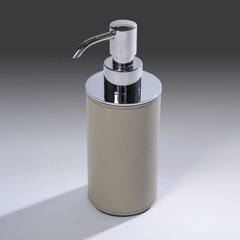 Dosificador Poseidon Round revestido em Couro Liverpool, com formato arredondado e design contemporâneo.
